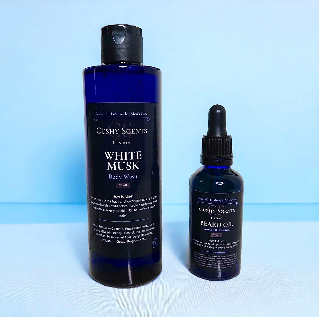 Introducing our exquisite Men's Beard Brilliance & Body Refresh Kit, a heavenly assortment of grooming essentials that will elevate your self-care routine to new heights. This meticulously curated set includes a nourishing beard oil formulated with an indulgent blend of black cumin, apricot kernel, sweet almond, jojoba and hemp seed oils infused with vitamin E for unparalleled hydration and conditioning. Our body wash brings a new level of sophistication to your shower/bath routine. The delicate scent of white musk lingers long after you've dried off, providing an alluring fragrance that lasts and leaves you feeling fresh throughout the day. Crafted with utmost care using all-natural ingredients, this combo is lovingly handmade to cater to all skin types.